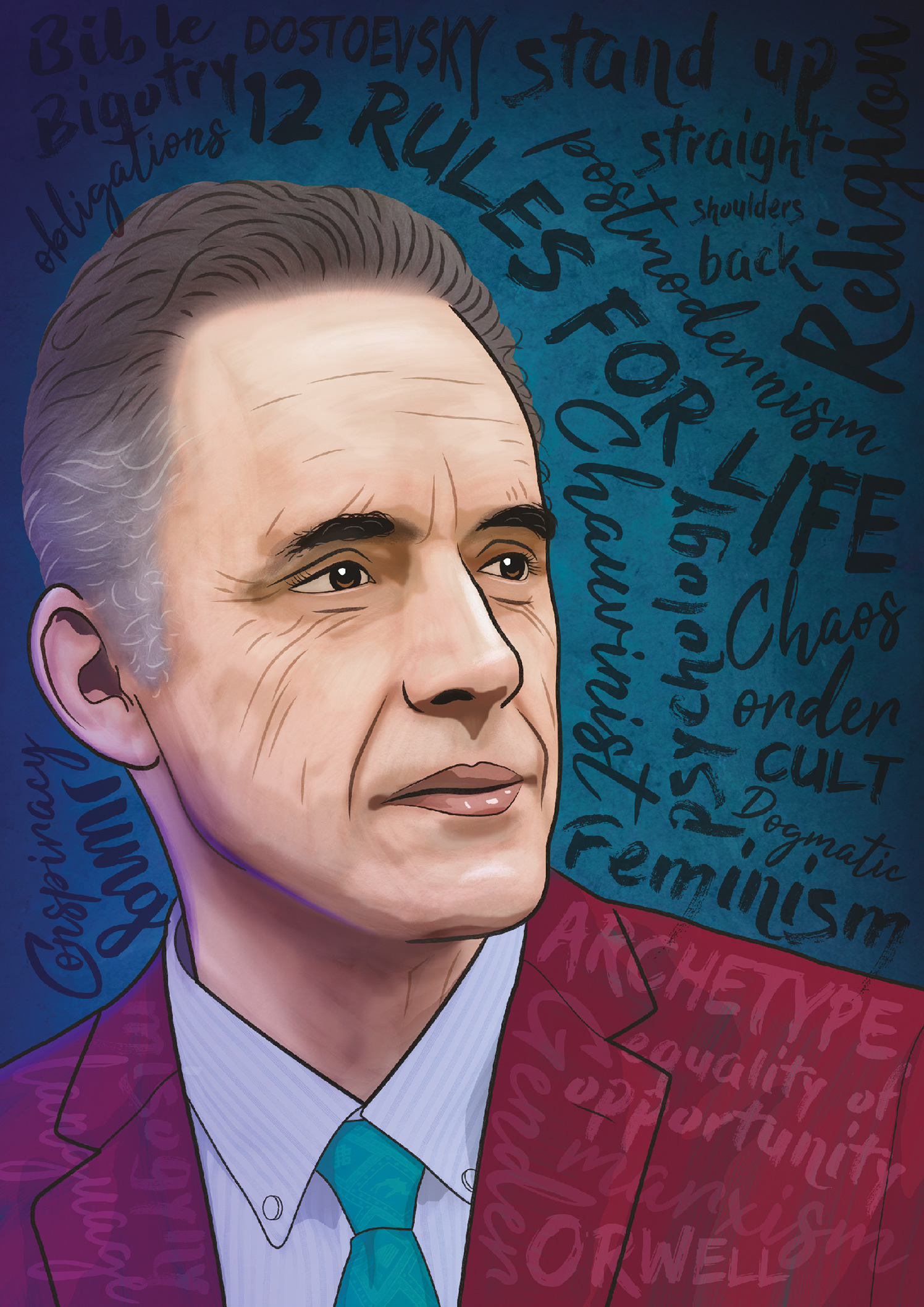 The Canadian psychology professor and best selling author has been described as a culture warrior. He's a controversial figure and well known for his lectures and debates. I decided to illustrate the discussion surrounding his popularity with chaotic lettering.